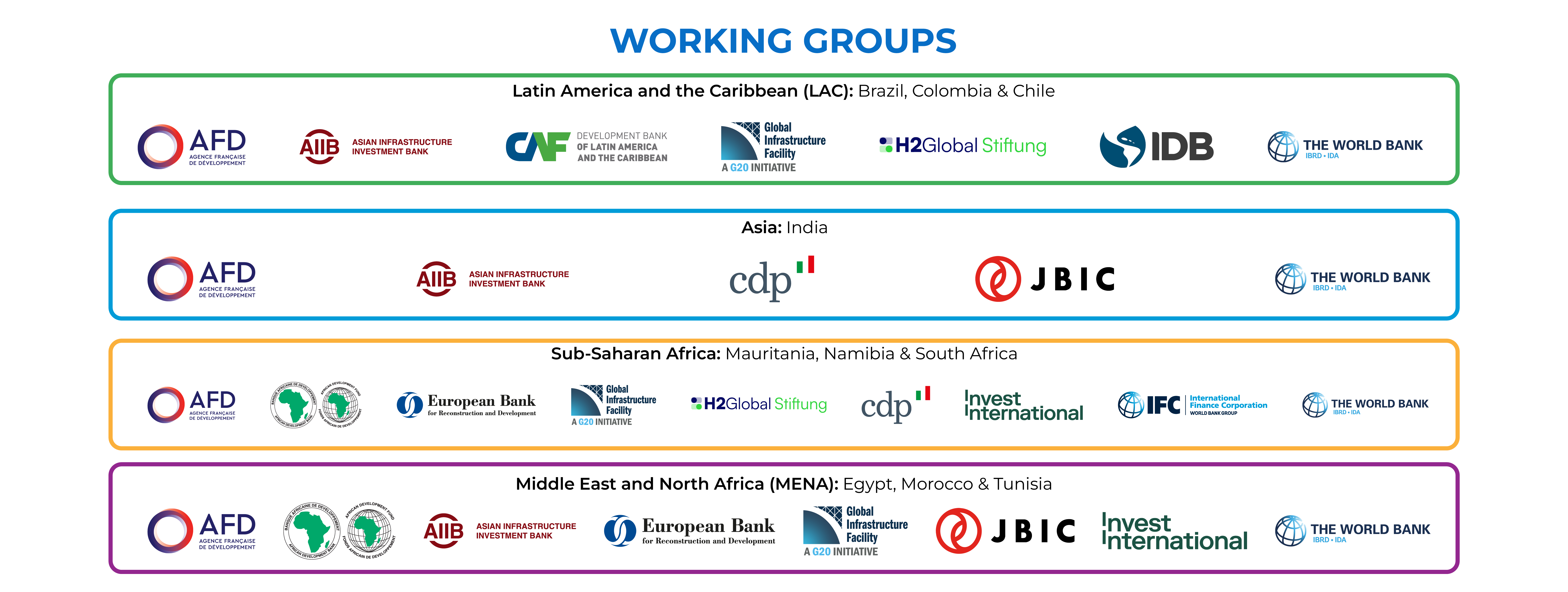 The Initiative unites 15 national and international development finance institutions including: the World Bank Group (IBRD, IFC and MIGA); the African Development Bank; Agence Française de Développement; Asian Infrastructure and Investment Bank; Development Bank of Latin America and the Caribbean (CAF); Cassa Depositi e Prestiti (CDP); European Bank for Reconstruction and Development (EBRD); H2Global; Invest International; Inter-American Development Bank; Invest International; Japan Bank for International Cooperation (JBIC) and KfW.